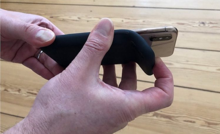 Die flexible obere Kante des Cases wird leicht gebogen, das iPhone rutscht von oben rein, setzt direkt auf dem Lightning-Anschluss auf. It just works.