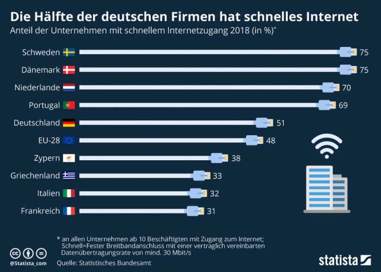 Am besten schneiden Schweden und Dänemark ab. Dort haben drei von vier Firmen schnelles Netz. Weniger gut stehen Griechenland (33 Prozent), Italien (32 Prozent) und Frankreich (31 Prozent) dar.