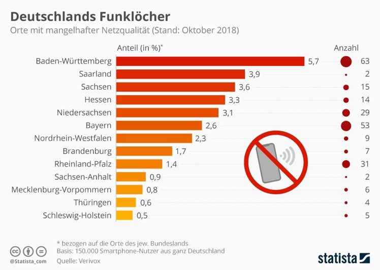 Besonders schlimm ist es in Baden-Württemberg. Dort gibt es 63 Ortschaften, deren Netzqualität als „Mangelhaft“ eingestuft wird – 5,7 Prozent der Fläche sind mit Funklöchern versehen. Prozentuell steht Schleswig-Holstein mit nur 0,5 Prozent am besten dar.