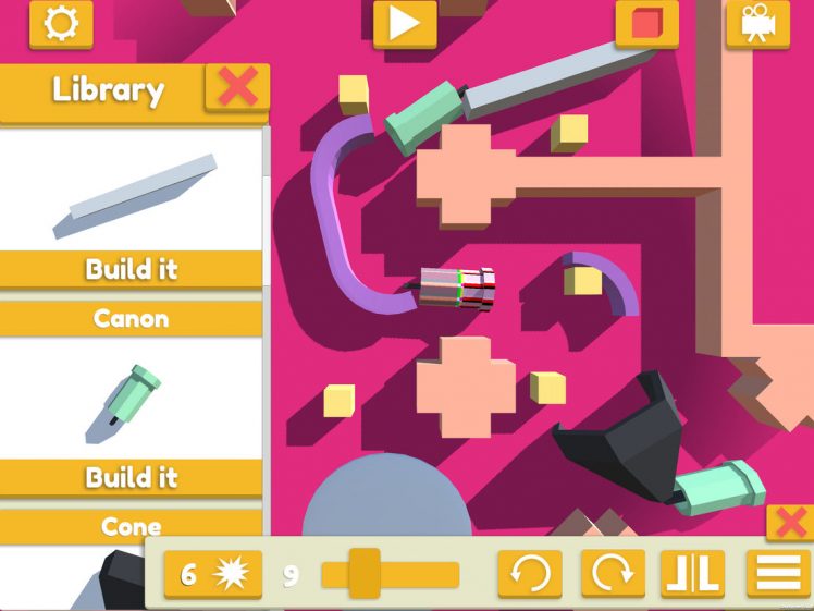 Mit Kanonen, Blöcken, Zylindern und mehr versucht Ihr, Banen zu legen. Am Ende seht Ihr der Murmel zu, wie sie sich auf den Weg macht. Ihr könnt die Level auch mehrfach angehen und unterschiedliche Lösungen suchen.