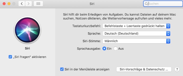Unter macOS: In den Systemeinstellungen gibt es das Untermenü „Siri“. Ein Klick darauf führt zu einem Popup. Dort ändert Ihr bei „Siri-Stimme“ per Pfeiltaste die Auswahl in „Männlich“.