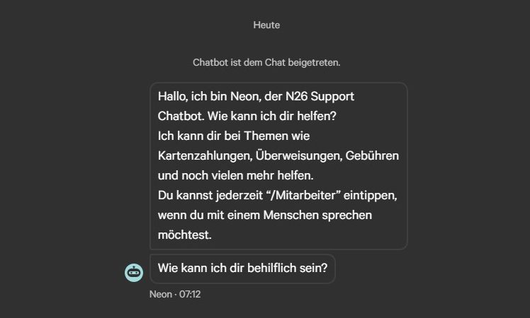 Wer in der App oder auf der Website der Bank einen Support-Chat startet, der wird zuerst mit einem Bot verbunden. Dieser trägt den Namen Neon und soll bei einfachen Problemen helfen.