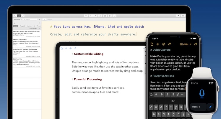 Drafts: Ab sofort gibt es den bekannten Text-Editor auch für macOS. Die Entwickler bieten den Sync mit der iOS-App an und setzen zur Nutzung aller Funktionen auf ein Abo-Modell: 1,99 Euro pro Monat oder 20,49 Euro pro Jahr.