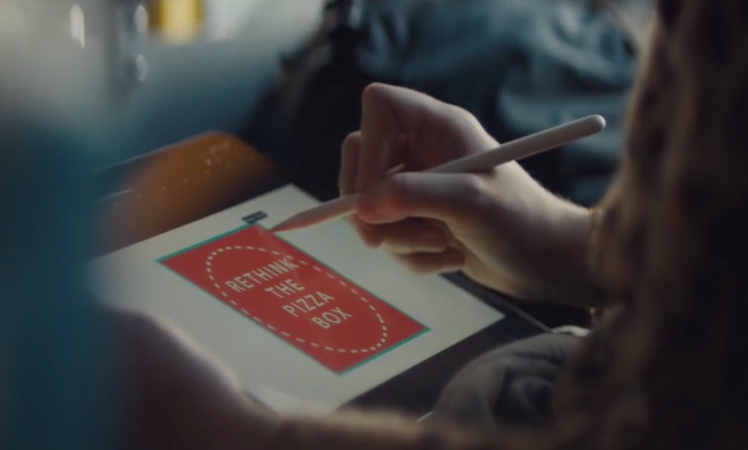 Es ist drei Minuten lang, also fast schon ein Kurzfilm, und dreht sich um das Thema „Apple at Work“ – Apple bei der Arbeit. Gezeigt wird (selbstironisch) ein Design-Team, das schnell einen Pizzakarton gestalten soll.