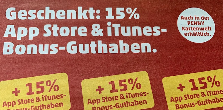 Update: Es gibt zwei weitere Angebote ab Montag, danke an fleißige Leser, die sich bei uns gemeldet haben. Bei Rossmann erhaltet Ihr 15 Prozent Extra-Guthaben auf Karten im Wert von 25, 50 und 100 Euro (danke Bernd). Und auch Penny mischt ab Montag mit (danke Michael, auch für den Screenshot). Penny gewährt ebenfalls 15 Prozent Bonus auf die drei genannten Kartengrößen.