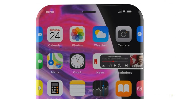 Das dort gezeigte iPhone besitzt ein Display, das die komplette Vorderseite einnimmt. Displayränder gibt es nicht. Der Screen wölbt sich um die Kanten des Geräts.