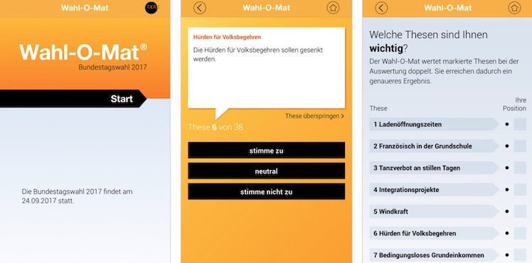 Bei allen Thesen müsst ihr Euch zwischen „stimme zu“, „neutral“ und „stimme nicht zu“ entscheiden, optional könnt ihr einzelne Thesen überspringen. Am Ende könnt Ihr dann eure Standpunkte mit den Antworten der Parteien vergleichen.