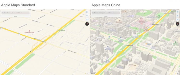 In Apple Maps werden innerhalb Chinas außerdem viel detailliertere Karten angezeigt. Dies fällt besonders in Großstädten auf. In Peking, Shanghai, Shenzhen und Co. gibt es sogar 3D-Karten. Obiges Bild, von einem Reddit-User geteilt, zeigt den drastischen Unterschied