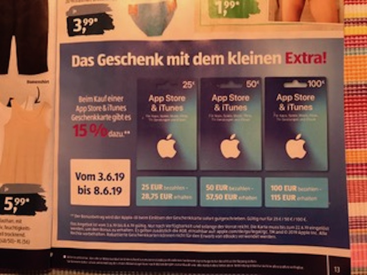 So auch heute: Ab Montag, 3. Juni, könnt bis zum 8. Juni bei Aldi Süd iTunes-Karten mit Bonus-Guthaben erwerben. Der Deal gilt für Karten im Wert von 25, 50 und 100 Euro.