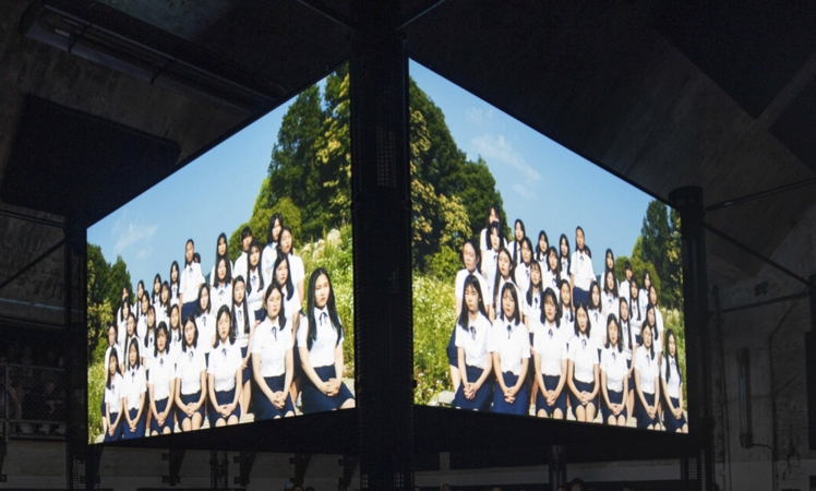 Ausgewählte Gäste konnten das Kunstwerk samt Video, in dem Peggy Gou selbst auch zu sehen ist, bewundern. Fotos von Apple, unten ist eines zu sehen, zeigen den imposanten Leinwand-Aufbau. Dazu gab es ein DJ-Set der Künstlerin zu hören.
