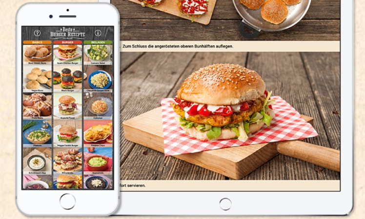 Die Rezepte sind auf der Startseite in die übersichtlichen Kategorien „Basics“, „Burger“ und „Beilagen“ sortiert, sodass Ihr schnell ein ganzes Gericht erstellen könnt. Und unseren persönlichen Favoriten haben wir auch schon entdeckt: den Baconburger mit Süßkartoffelchips und Ketchupbeilage.