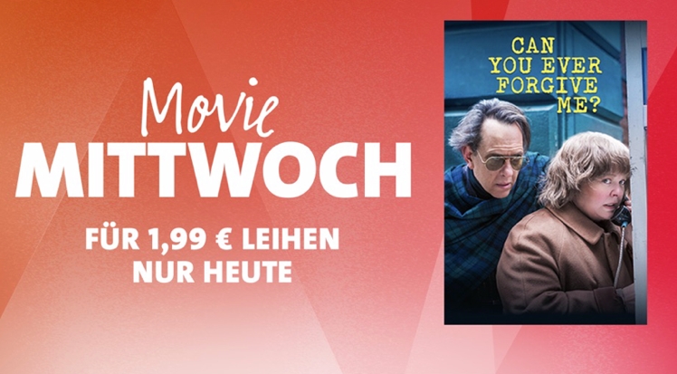 Jeden Mittwoch erhaltet Ihr einen ausgewählten Film für 24 Stunden zum Sonderpreis von nur 1,99 Euro. Heute erwartet Euch die Komödie Can You Ever Forgive Me? mit Melissa McCarthy.