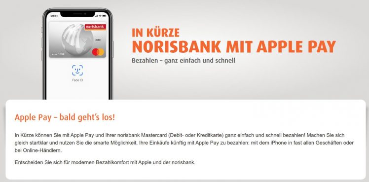 Genaue Details zum Start gibt es noch nicht. Es heißt nur, dass Apple Pay mit der Norisbank Mastercard genutzt werden kann. Sowohl Debit- als auch Kreditkarte werden unterstützt.