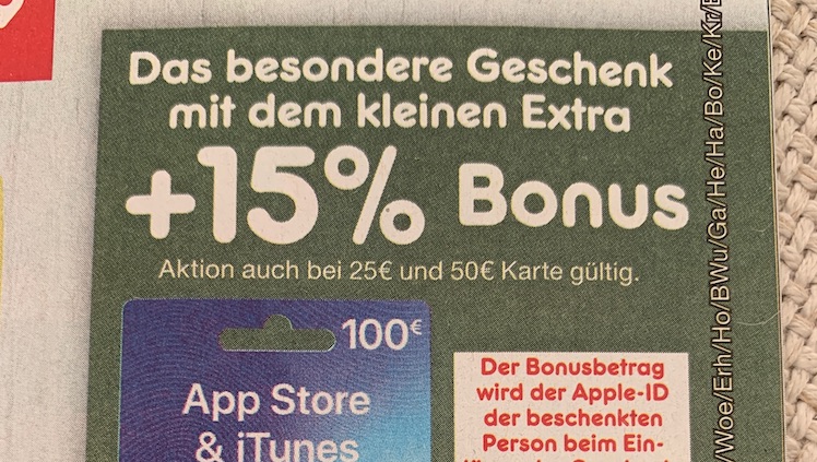 Penny: Dort erhaltet Ihr 15 % Bonus auf Karten im Wert von 25, 50 und 100 Euro (danke Bernd).