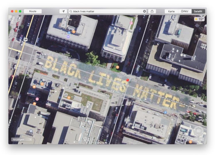 Auch Ihr könnt Euch die Aktion digital ansehen. Startet dafür einfach Eure Karten-App von Apple in iOS oder am Mac und gebt im Suchfeld „Black Lives Matter“ ein.