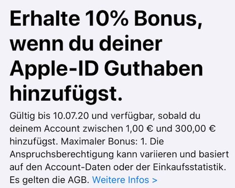 Wenn Ihr Eurer Apple ID Guthaben hinzufügt, erhaltet Ihr 10 Prozent extra geschenkt. Dies gilt fürs Aufladen von 10, 25, 50 oder 100 Euro.