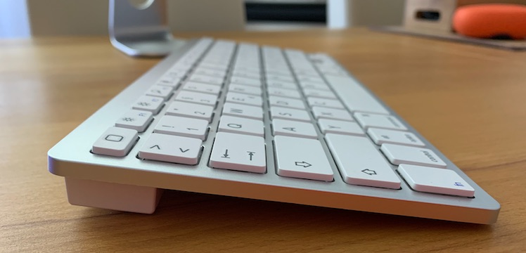 Die Tastatur zu einem Preis von 16,99 Euro schien erst zu billig. Aber fast 427 positiven Bewertungen und die elegante Optik weckten dann doch sein und unser Interesse. Passt sie doch vom Design prima zu den vorhandenen Macs und iPads auf dem Schreibtisch.