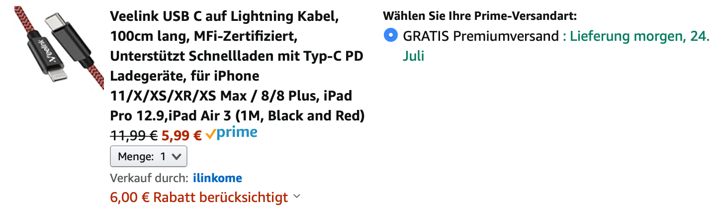 PS: Die günstige USB-C-Alternative liefert Veelink, das uns den Code D6J4N9OI geschickt hat: So erhaltet Ihr das zertifizierte 1-m-Kabel für 5,99 Euro oder 2 m für gerade mal 6,99 Euro.