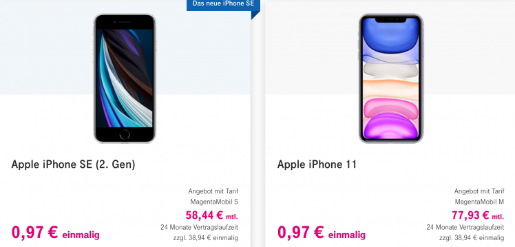 Beispiele: Das iPhone 11 Pro mit 64 GB Speicher im MagentaMobil XL Tarif kostet damit nur 97 Cent – bisher waren es 98 Euro. Alternativ: Im Tarif MagentaMobil L mit Premium-Handy zahlt Ihr noch 97,43 statt 194,91 Euro.