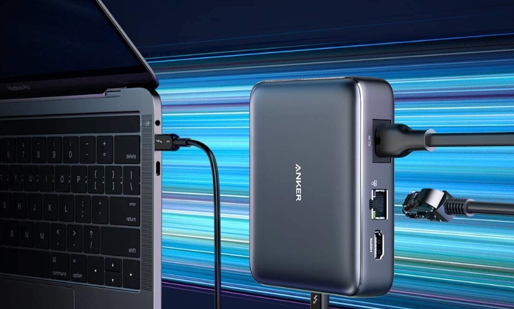 Das PowerExpand 7-in-1 ist eine kompakte Thunderbolt 3 Dockingstation. Sie hat insgesamt sieben Ports: USB-C, USB-A, SD & microSD, Thunderbolt 3 Upstream, HDMI 2 und Ethernet.