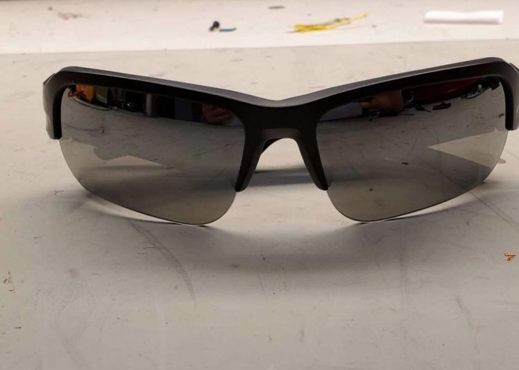 Auf den Fotos zu sehen ist eine Sonnenbrille sowie diverse Beschreibungen. Die Brille soll nicht nur die Augen schützen, sondern mit eingebauten Speakern auch den Ohren schmeicheln.