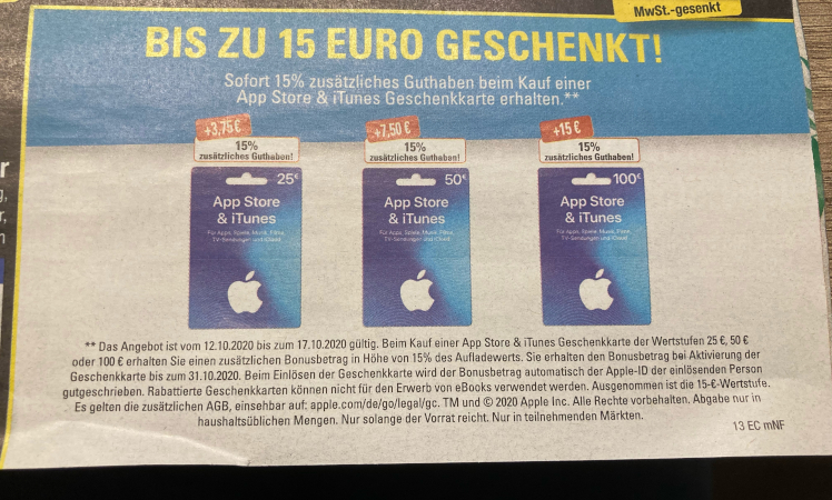 - 100 Euro iTunes-Karte kaufen + 15 Euro Bonus