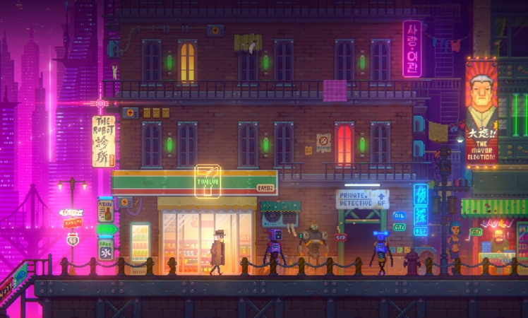 Tales of the Neon Sea: Das futuristische Spiel in einer Zeit, in der intelligente Roboter und Menschen zusammenleben, ist in einem knalligen, detailreichen Pixel-Stil gehalten.