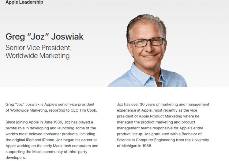 Seine Rolle wird nun von Greg Joswiak ausgeübt. Dessen Portrait wurde nun der Website hinzugefügt. Greg „Joz“ Joswiak wird als „Senior Vice President, Worldwide Marketing“ aufgeführt.