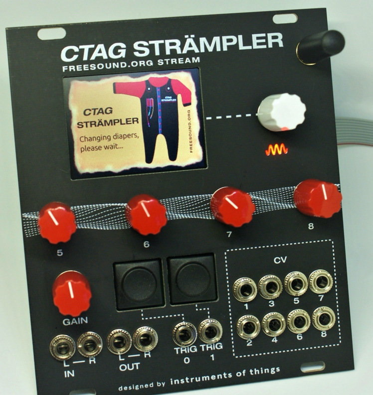 Ein weiteres beispielhaftes Erzeugnis der CTAG-Gruppe ist der Strämpler, ein Sampler im Eurorack-Format, der Musik via WLAN streamen und live in Kombination mit anderen Sounds und Synth-Modulen verarbeiten kann. Hier ein Foto – ganz unten findet Ihr auch ein Demovideo.