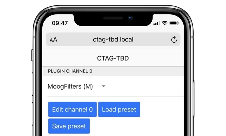 Wird sich dann mit ihm verbunden, kann im Browser die Adresse „ctag-tbd.local“ aufgerufen werden und er zeigt dann ein Steuerungsinterface für die Funktionen des Moduls an. Nun kann eingestellt werden, mit was für einem Plugin welche Art der Klangerzeugung oder -bearbeitung geleistet werden soll (s.u.).
