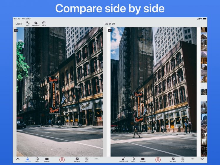 Außerdem wurde die Preis-Struktur etwas überarbeitet. Die Basic-Version kann gratis geladen werden. Per In-App-Kauf schaltet Ihr mit dem „Library Power Pack“ für einmalige zu zahlende 8,99 Euro den Vergleichs-Modus, die smarte Suche, die Foto-Info-Funktion mit Metadaten, die Bearbeitung von Fotos, den Import und neue Icons bzw. den Dark Modus frei.