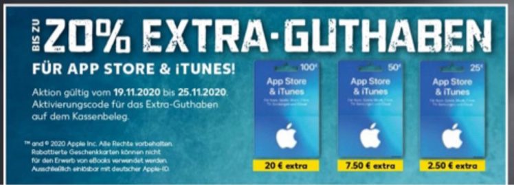 Bei Kaufland (Filialfinder) erhaltet Ihr bis zu 20 Prozent Bonus (danke Bernd, auch für den Prospekt-Screenshot). Der Preisvorteil gilt bis einschließlich 25. November. Auf dem Kassenbon findet Ihr den Aktivierungscode.