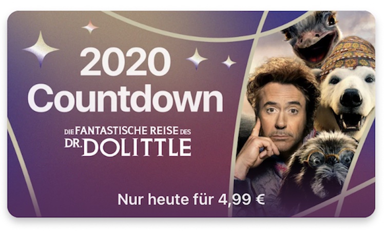 An Tag 25 der Aktion bietet Apple heute die Komödie „Die fantastische Reise des Dr. Doolittle“ für nur 4,99 Euro zum Kauf an. Der Film mit Robert Downey Jr. in der Hauptrolle lässt sich bis Mitternacht zum Sonderpreis laden.