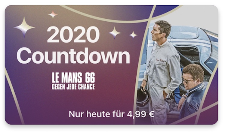 An Tag 19 der Aktion bietet Apple heute das Renn-Drama Le Mans für nur 4,99 Euro zum Kauf an. Der Streifen mit Matt Damon und Christia Bale lässt sich bis Mitternacht zum Sonderpreis laden.