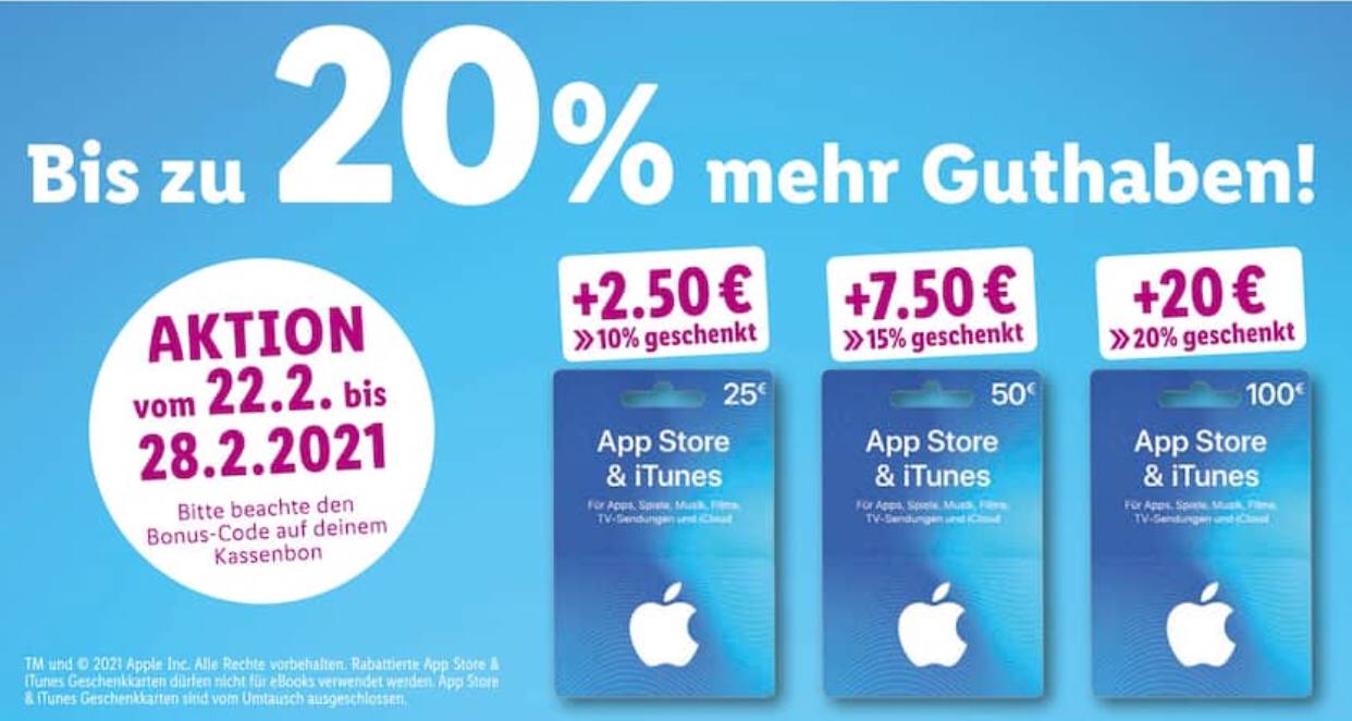 Ab Montag gibt es wieder neue Boni auf iTunes-Karten. Bei LIDL erhaltet Ihr bis zu 20 Prozent Extra-Guthaben – der Bonus gilt für Karten im Wert von 25, 50 und 100 Euro (danke Bernd und wareno).