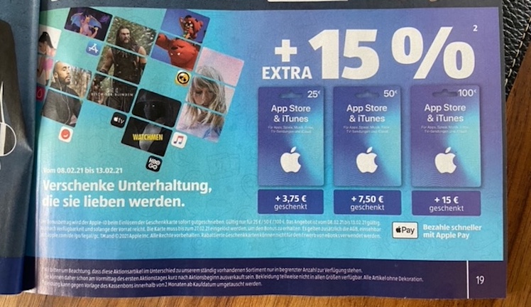 Bei ALDI Nord und ALDI Süd erhaltet Ihr jeweils 15 Prozent Extra-Guthaben möglich – der Bonus gilt für Karten im Wert von 25, 50 und 100 Euro.