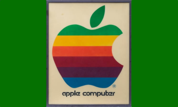 Bei dem Exponat handelt es sich um eines der ersten Werbe-Schilder für den Handel. Es ist ca. 122 x 152 cm groß und zeigt das Apple-Logo in seinen klassischen Regenbogen-Farben. Darunter steht „apple computer“.