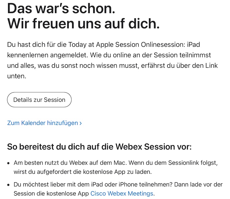 Nach der Anmeldung schickte mir Apple eine kurze Mail mit dem Teilnahme-Link. Er war mit einem Klick geöffnet. Doch damit begann die Session (leider) noch nicht. Apple setzt bei den Online-Sessions auf Cisco Webex. Meine Meinung: Es gibt praktischere Meeting-Lösungen. Denn bei Webex Meeting müsst Ihr Euch noch mal mit Euren Daten registrieren, dann wahlweise eine Browser-Extension oder eine App herunterladen. Hab ich gemacht, aber sämtliche Cisco-Webex-Dateien und Ordner nach der Session wieder gelöscht…