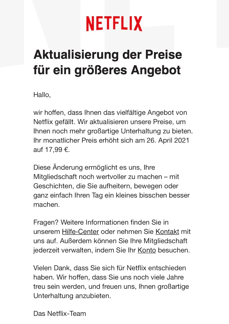 Auch ich habe eine Mail von Netflix erhalten, wie viele Kunden heute bzw. in den nächsten Tagen. Wer der Preiserhöhung nicht zustimmt oder eine günstigere Abo-Variante wählt, ist raus.
