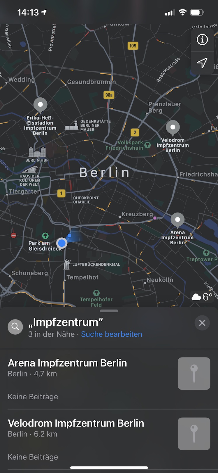 Jetzt ist die Funktion auch in Deutschland gelandet. Ihr könnt das Stichwort „Impfzentren“ bei Apple Maps eingeben und erhaltet prompt die Ergebnisse. Bei unserem Test hier in Berlin wurden uns drei Impfzentren anzeigt:
