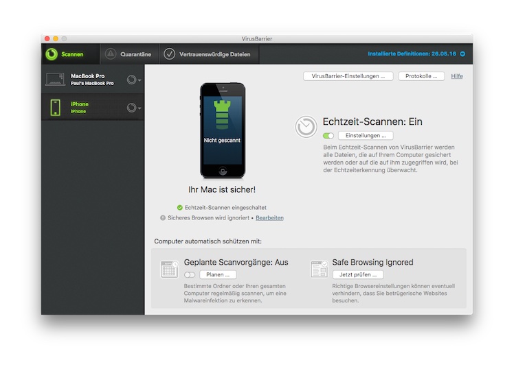 Das Scannen eines iOS-Geräts jeder Art ist ein Kinderspiel. Dafür muss in den Einstellungen von VirusBarrier vorher nur der Punkt „iPhone, iPad and iPod touch“ aktiviert werden. Wird dann das Gerät an den Mac angeschlossen, erkennt die Software es direkt.