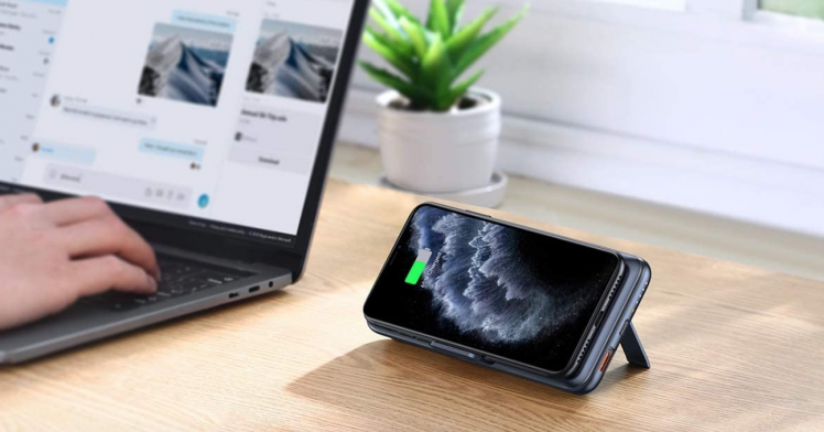 Ihr könnt Euer iPhone via Qi kabellos auf der Powerbank aufladen, auch USB-A und USB-C Port sind an Bord. Wird das iPhone kabellos aufgeladen, könnt Ihr das Gerät samt Powerbank aufstellen und als Ständer nutzen.