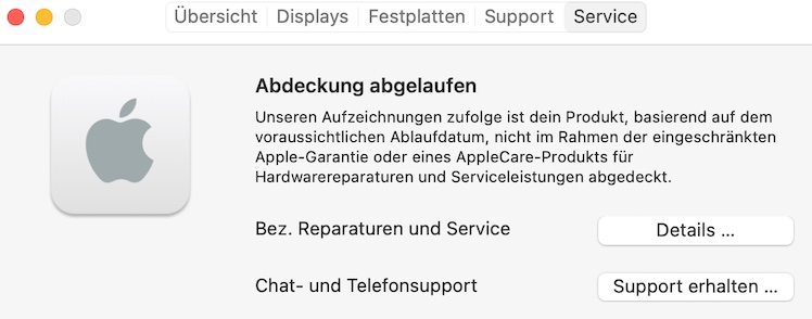 Wenn Ihr das Tab „Service“ im Fenster „Über diesen Mac“ öffnet, seht Ihr dort direkt die Informationen über den aktuellen Status der Garantie. Auch AppleCare+, sofern gebucht, wird nun dort angezeigt.