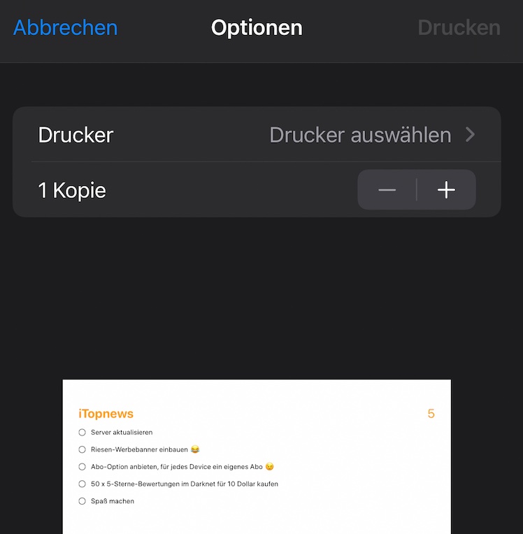 Natürlich muss zu diesem Zweck noch einen Drucker im WLAN-Netzwerk eingebunden haben – oder via Kabel mit dem iDevice verbunden sein. Dann erhaltet Ihr am Ende eine schicke ausgedruckte To-Do-Liste, die Ihr dann fröhlich abarbeiten könnt.