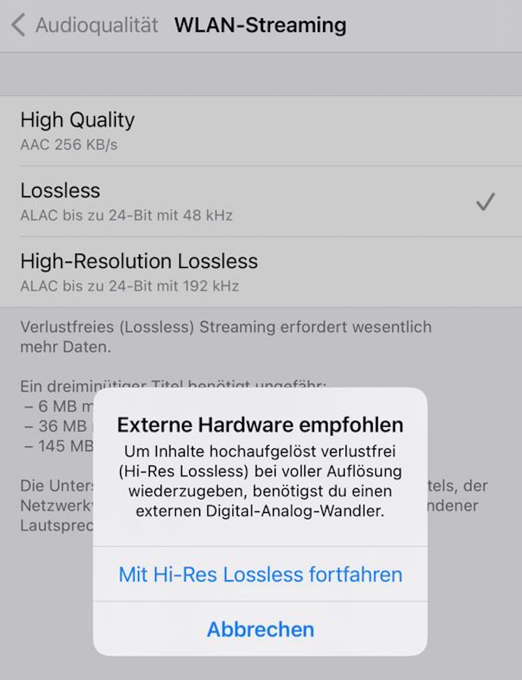 Kabelgebundene Kopfhörer können mit dem Lightning-Audio-Adapter von Apple verwendet werden, um die höhere Lossless-Auflösung zu nutzen. Weitere Details dazu findet Ihr auch hier bei uns. Außerdem braucht Ihr für die Wiedergabe folgende Geräte: