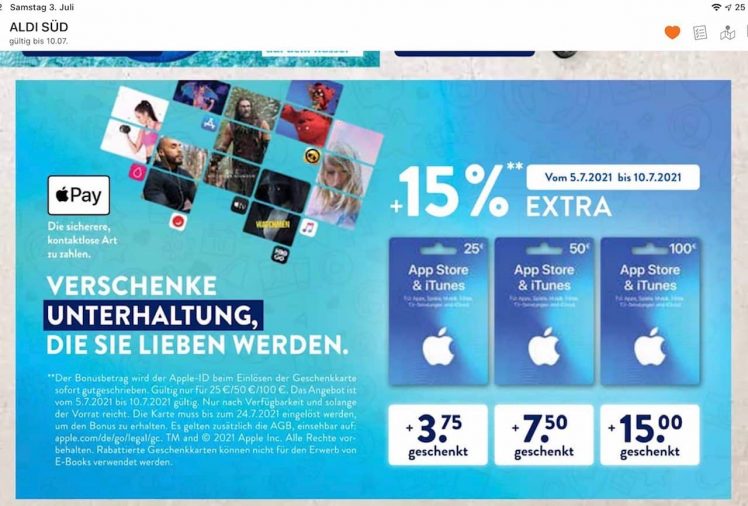 Ab dem heutigen 5. Juli bis zum 10. Juli erhaltet Ihr bei Aldi (Süd und Nord) Bonus-Guthaben (danke Walter). Bitte fragt vor dem Kauf immer an der Kasse nach, ob Eure Filiale teilnimmt.