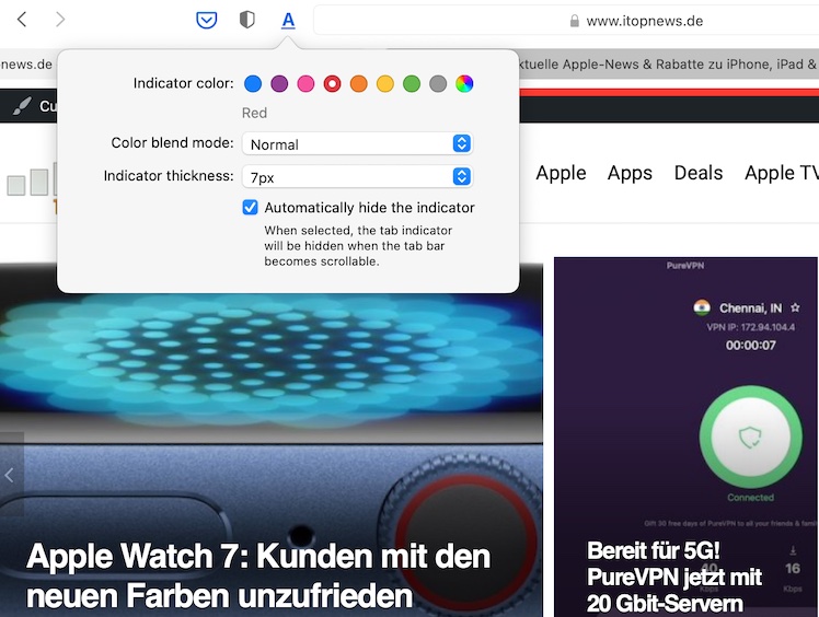 Darin könnt Ihr eine von acht Farben auswählen. Es wird dann immer ein Balken in dieser Farbe unter dem aktiven Tab angezeigt, damit Ihr ihn besser identifizieren könnt. Für noch mehr Sichtbarkeit lässt sich dessen Dicke in Pixeln modifizieren.