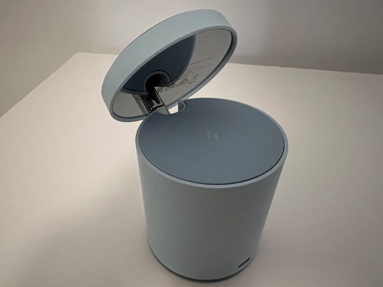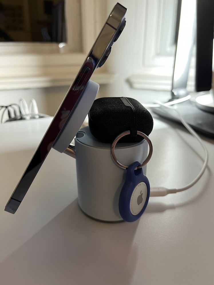 Das Zylinder-formige Gerät kann das iPhone und AirPods gleichzeitig kabellos aufladen. Der obere Teil kann aufgeklappt werden. Das iPhone lässt sich dann über MagSafe am Ständer befestigen.