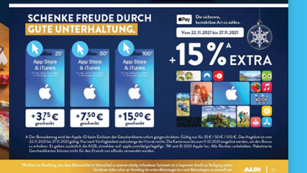 Aldi legt bei Karten im Wert von 25, 50 und 100 Euro jeweils 15 Prozent Guthaben obendrauf.