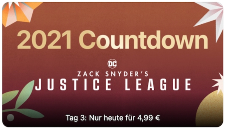 Am ersten Tag der Aktion bietet Apple heute den Film „Zach Snyder’s Justice League“ für nur 4,99 Euro zum Kauf an. Der Film mit Ben Affleck, Gal Gadot und weiteren Stars lässt sich bis Mitternacht zum Sonderpreis laden.